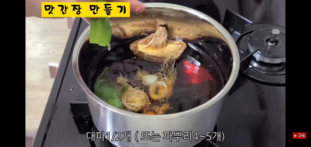향이 좋은 표고버섯 한 개와 대파 반 개를 함께 넣어 주시고, 여기에 파뿌리까지 더하면 풍미가 한층 더 살아납니다.