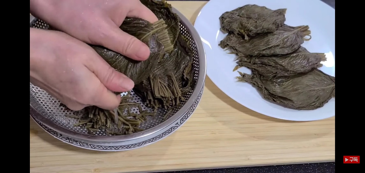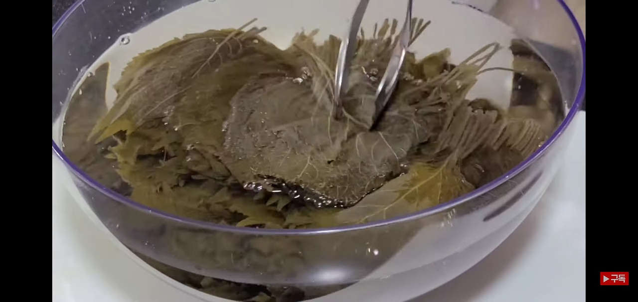 깻잎김치를 담글 때 필요한 깻잎 손질부터 해보겠습니다. 먼저, 소금물에 약 일주일 정도 절여 둔 깻잎을 준비한 뒤, 끓는 물에 10분 정도 데쳐줍니다. 이렇게 하면 깻잎이 한층 더 부드러워지고, 밥과 함께 먹기에 알맞은 식감으로 변합니다!