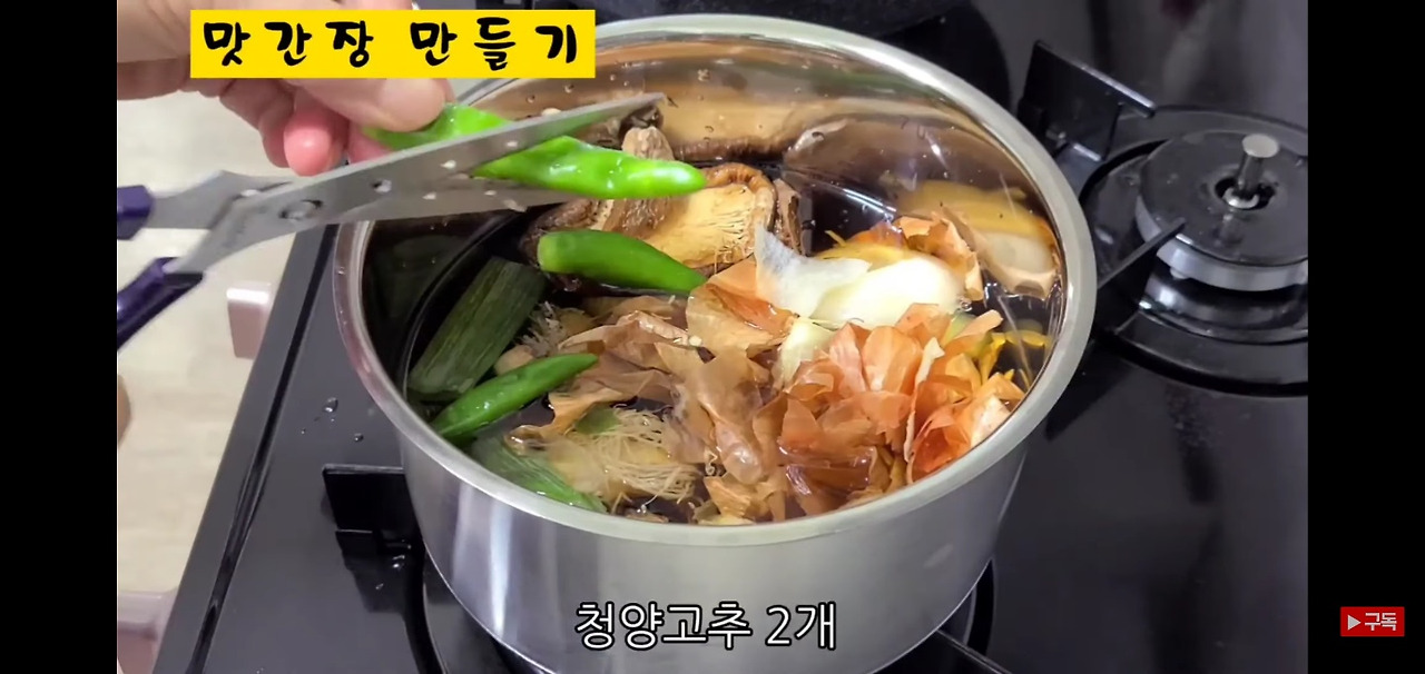 양파 한 개의 껍질도 함께 넣어 주시고, 매운맛을 더해 줄 청양고추 두 개는 반으로 갈라 넣어 주세요.