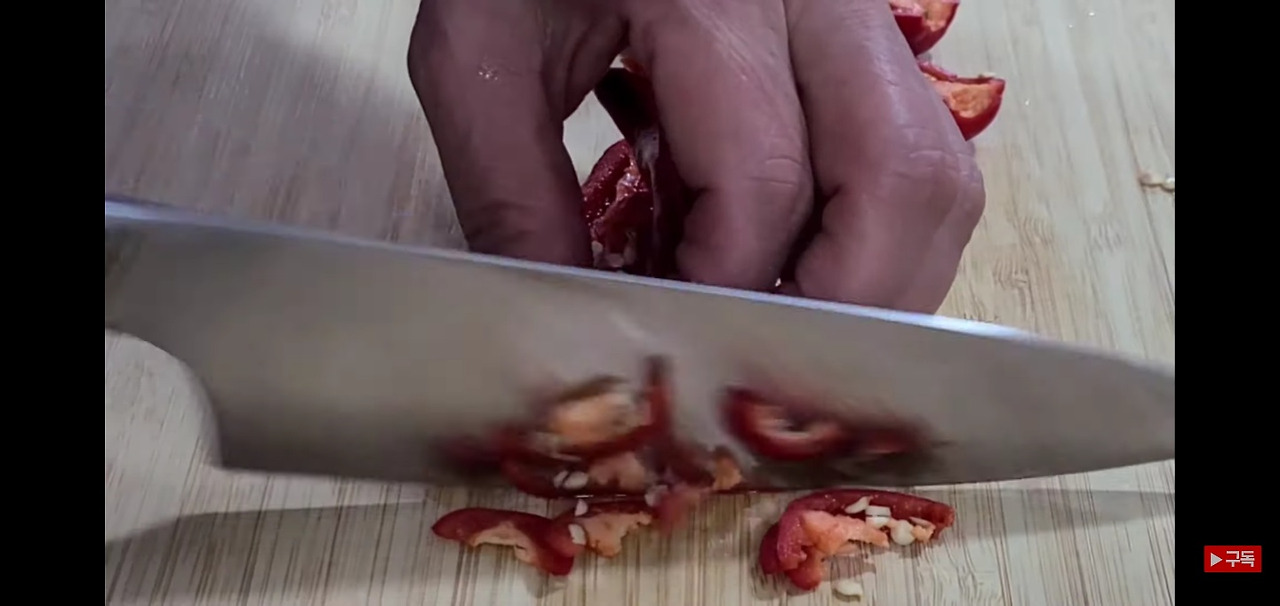 홍고추 2개는 반으로 갈라 얇게 썰어 주면, 깻잎김치에 들어갈 재료 손질이 모두 완료됩니다.