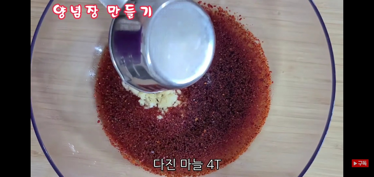 식혀 둔 맛간장에 고추가루 1컵 반과 다진 마늘 4스푼을 넣고 잘 섞어 주면, 깻잎김치에 매콤하고 알싸한 맛을 더할 수 있습니다.