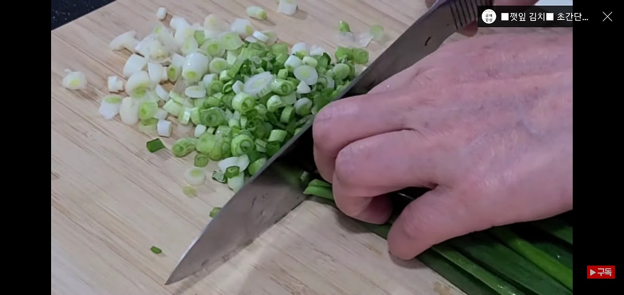 깻잎김치에 넣을 재료를 손질해 보겠습니다. 쪽파 한 줌을 먹기 좋은 크기로 송송 썰어 주세요.
