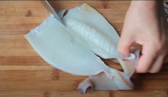 오징어 몸통에 사선으로 칼집을 넣어 주세요.