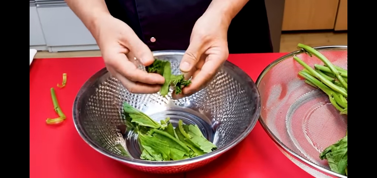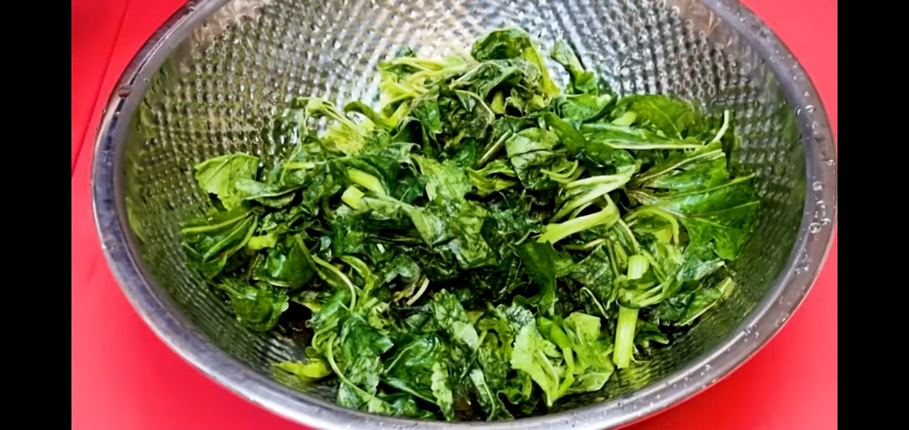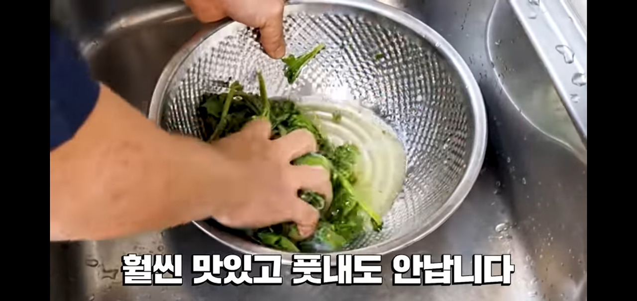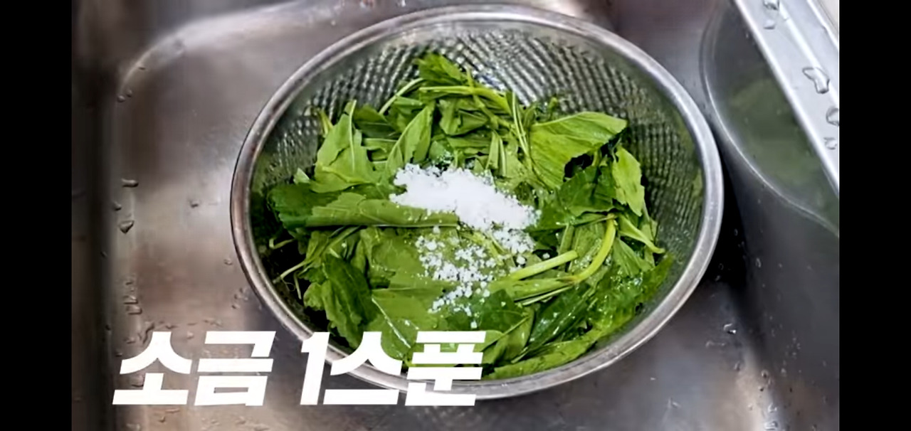 깨끗하게 씻은 아욱은 이제 채에 받쳐 물기를 빼주세요.