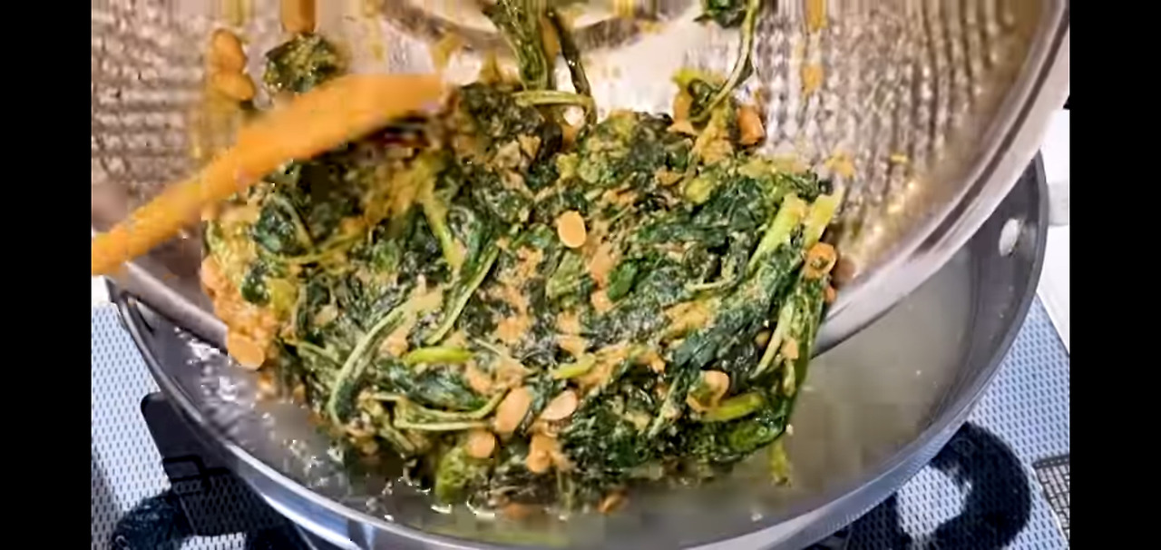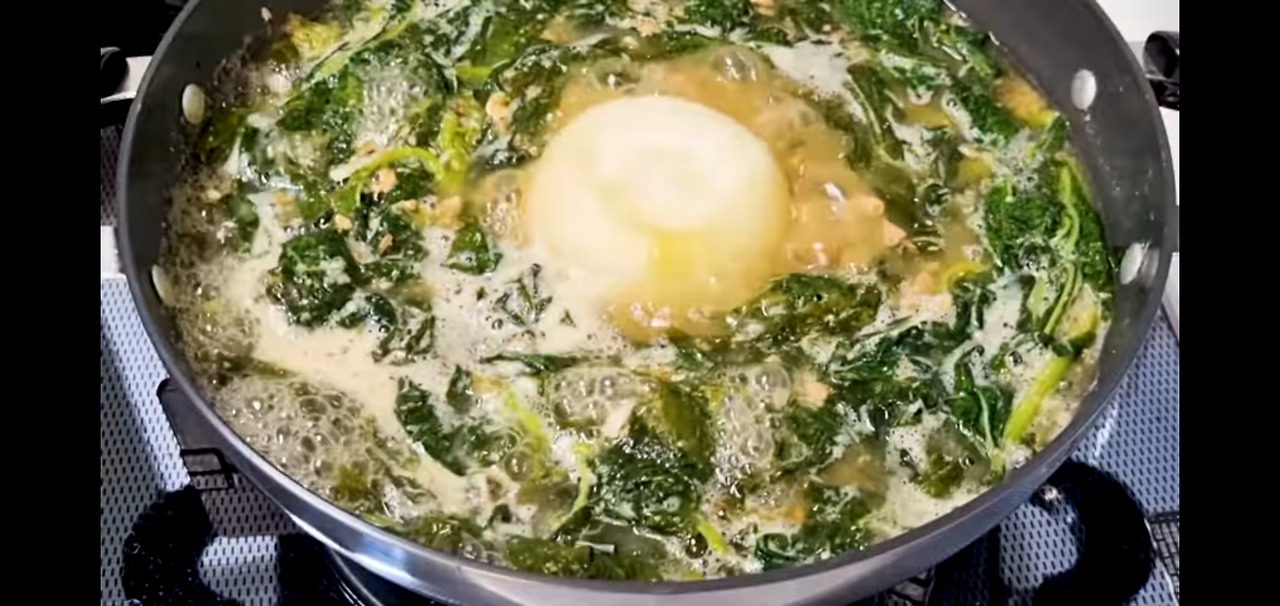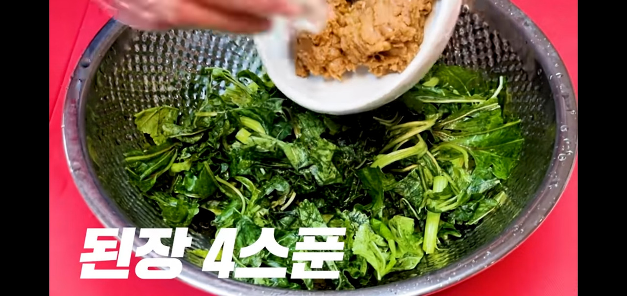 된장 4스푼과 다진 마늘 1스푼을 넣고, 아욱에 양념이 잘 스며들도록 잠시 두세요!