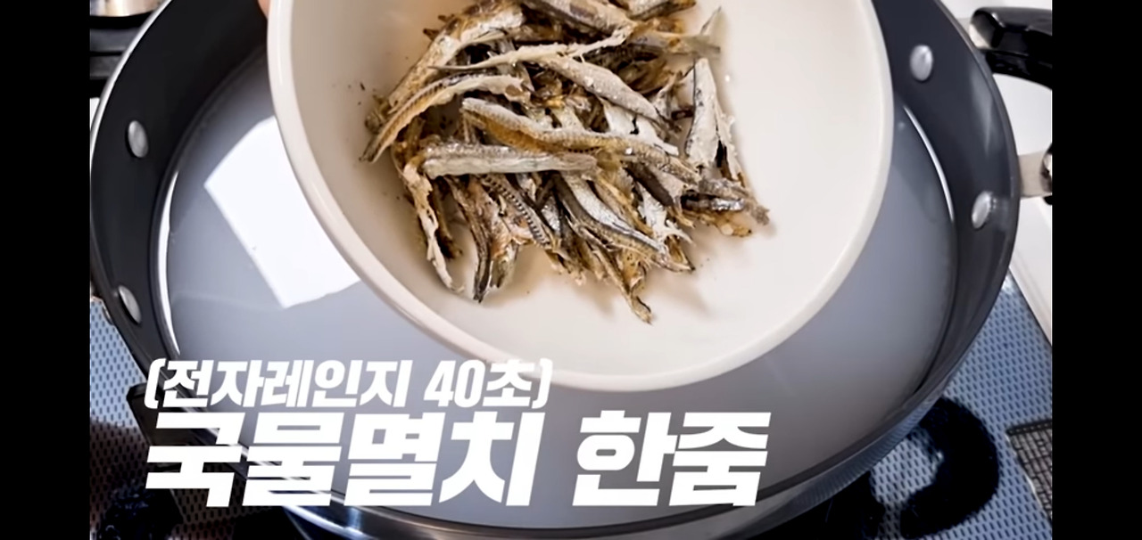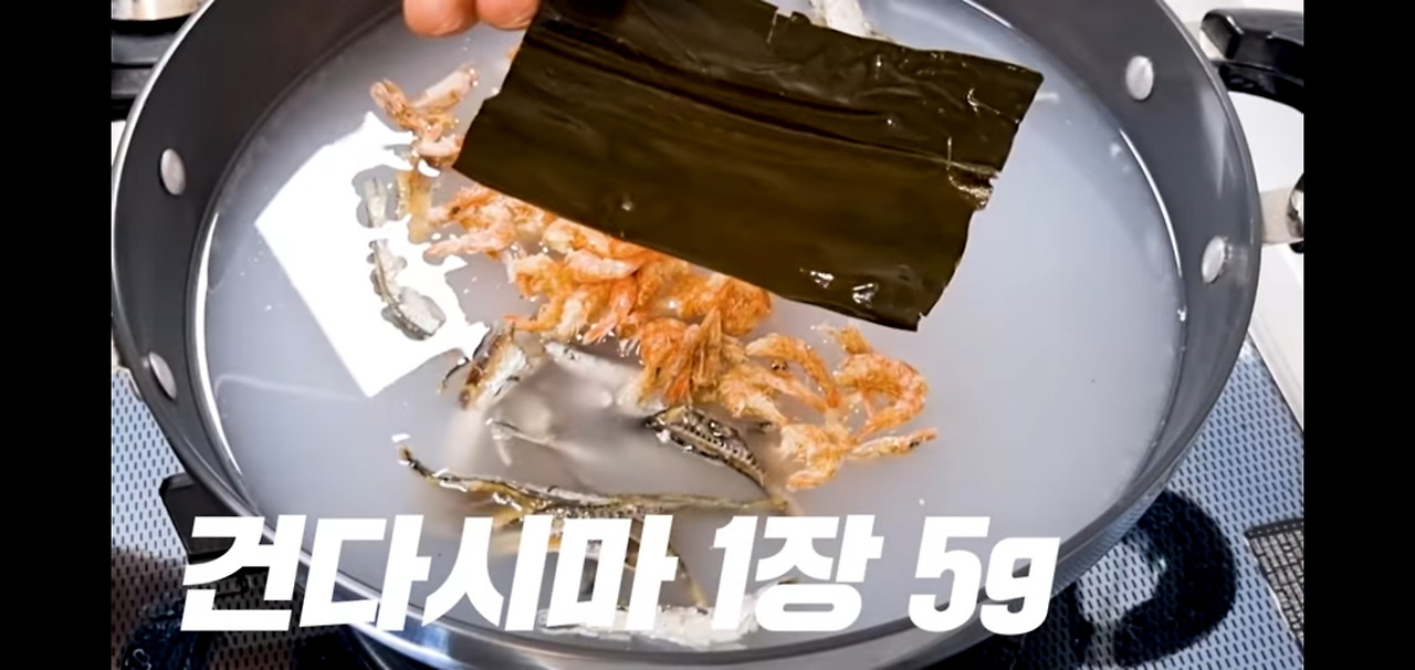 멸치 한 줌과 건새우 한 줌을 함께 넣고 끓여 주세요.