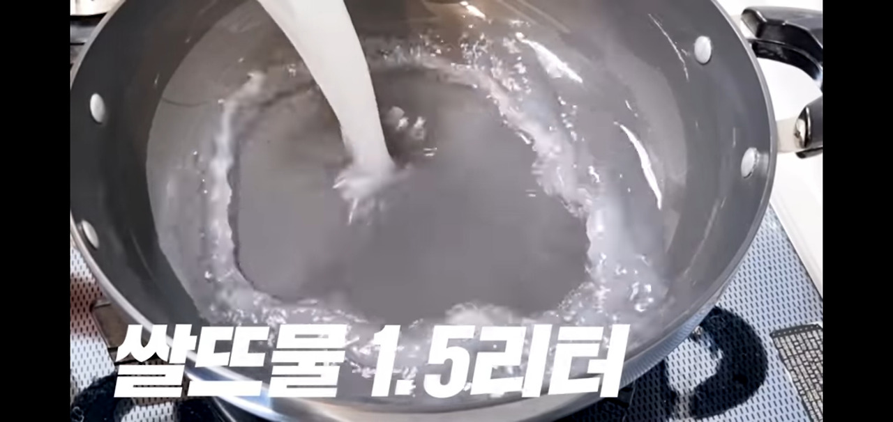 이제 아욱국 육수를 우려낼 차례입니다. 쌀뜨물 1.5L를 사용하면 깊고 풍미 가득한 아욱국을 만들 수 있어요!