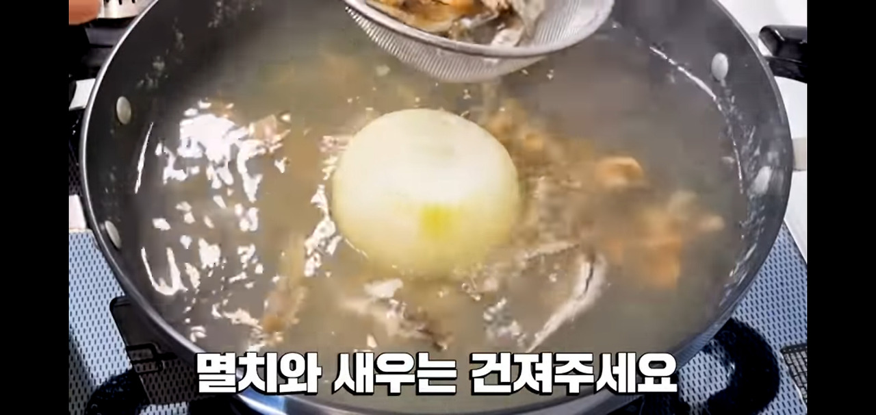 3분 더 끓인 육수에서 멸치와 새우를 건져내 주세요.