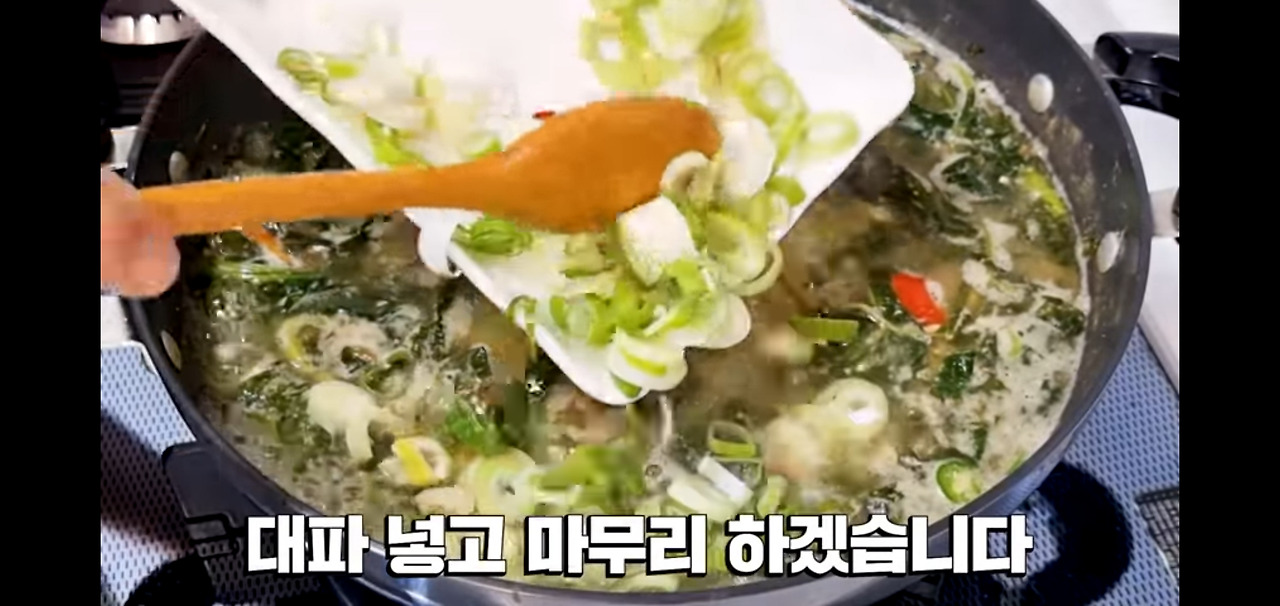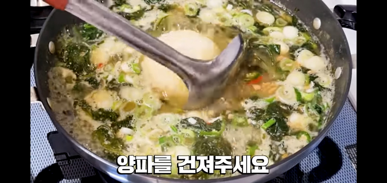 국이 다 끓었다 싶으면 마지막으로 대파를 넣어 마무리해 주세요. 양파는 건져내시면 됩니다.