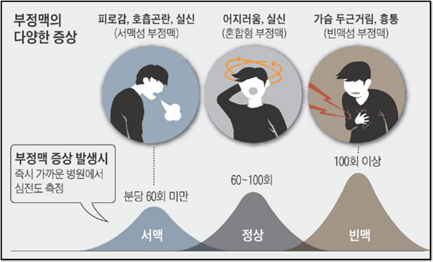 다음과 같은 증상 중 하나라도 나타난다면 부정맥일 가능성이 높으므로 병원을 방문해 정확한 진단을 받는 것이 중요합니다.