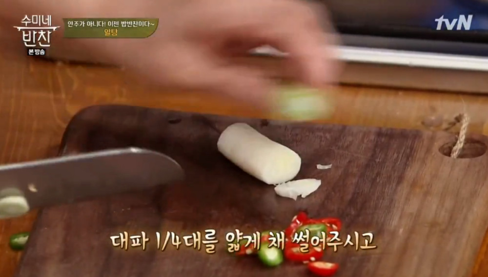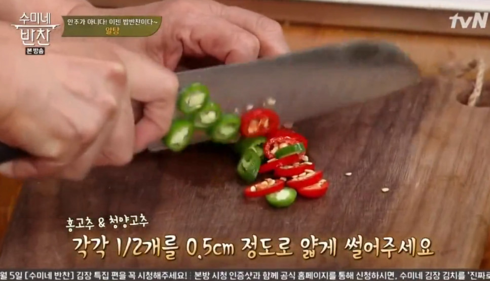 뚝배기에 물이 끓는 동안 알탕에 들어갈 재료들을 손질해주세요. 홍고추와 청양고추 각각 1/2개를 약 0.5cm 두께로 얇게 썰고, 대파 1/4대는 얇게 채 썰어주세요. 쑥갓은 있으면 넣고, 없으면 생략하셔도 됩니다.