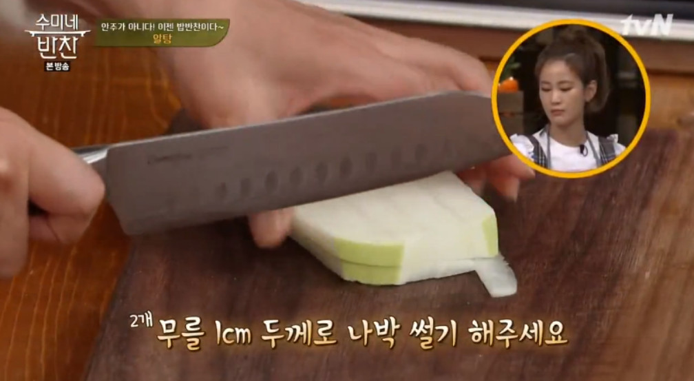 무는 1cm 두께로 나박썰기하여 약 1줌 정도 넣어주세요.