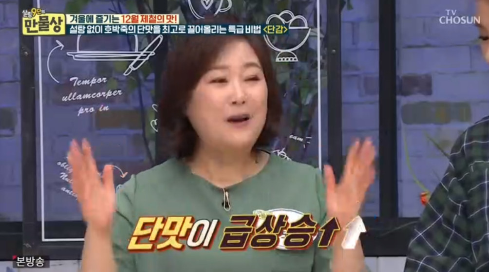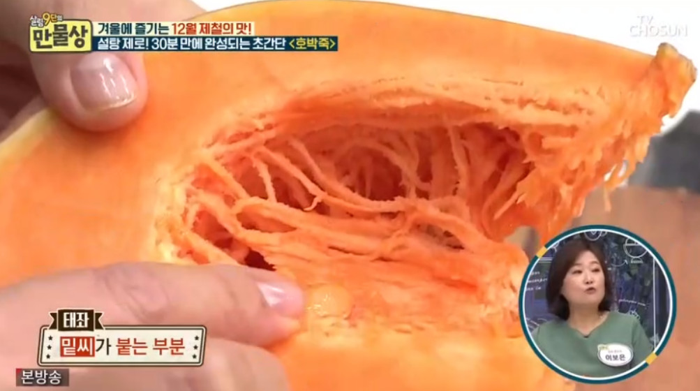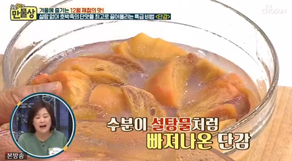 오늘 알려드리는 레시피에는 설탕이 들어가지 않는데요, 설탕 없이도 호박죽의 단맛을 최대한 살리는 이보은 요리연구가의 특급 비법은 바로 단감이라고 합니다.