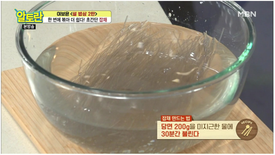 당면은 미지근한 물에서 약 30분간 불리는 것이 적당합니다. 30분간 불린 당면은 따로 준비해 둡니다.