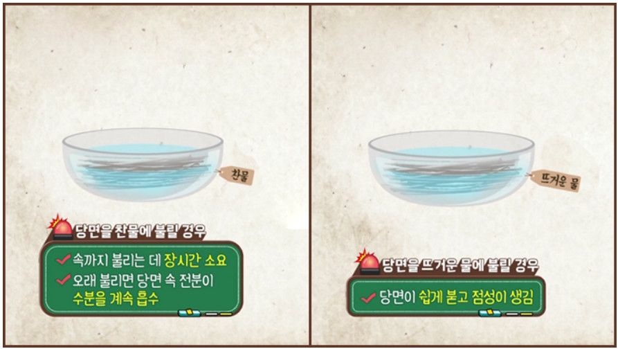 찬물에 담가두면 오래 불려야 하고 당면 속까지 골고루 불지 않으며, 당면은 수분을 계속 흡수하는 성질이 있어 오래 담가두는 것도 좋지 않습니다. 반대로 너무 뜨거운 물에 불리면 당면이 급격히 불어 점성이 생길 수 있으므로, 반드시 미지근한 물에 불려주세요.