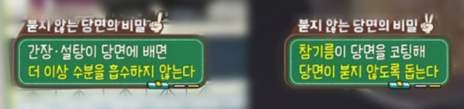 이 방법의 비법은 간장과 설탕을 미리 넣어 당면에 간이 배게 하는 것으로, 이렇게 하면 다른 수분이나 양념이 당면에 스며드는 것을 막아 불지 않게 됩니다. 또한 참기름으로 당면을 코팅해 불어나는 것을 방지해 줍니다.