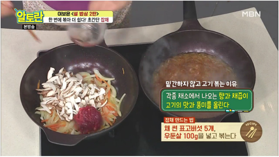 이제 다른 팬에 식용유 2큰술을 두르고 채 썬 당근과 양파를 먼저 볶아주세요. 어느 정도 익으면 표고버섯과 우둔살을 넣어 함께 볶습니다. 고기에 따로 간을 하지 않아도 채소에서 나온 향과 수분이 고기의 풍미를 살려줍니다.