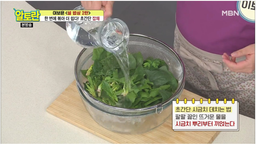 이 레시피는 초간단 방식으로, 대부분의 재료를 한꺼번에 볶는 방법입니다. 다만 시금치만 살짝 데쳐서 사용할 예정입니다. 시금치는 체에 올려 뿌리 부분이 위로 향하도록 놓아주세요. 뿌리와 잎의 익는 속도가 다르기 때문입니다.