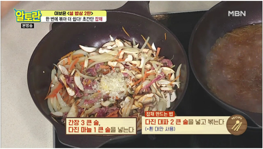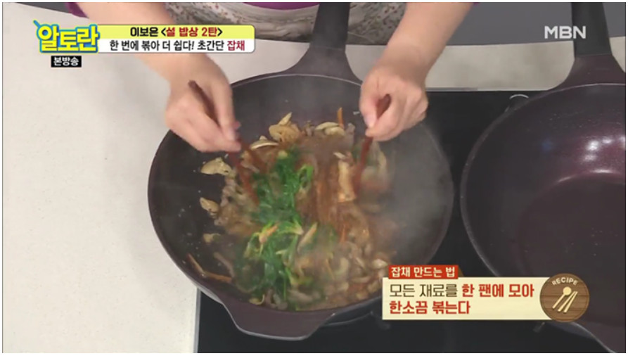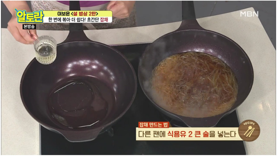 오늘 잡채 레시피의 핵심은 당면이 불지 않으면서 간이 잘 배게 하는 것입니다. 이를 위해 깊이가 있는 팬 2개를 준비합니다. 한쪽은 채소를 볶고, 다른 한쪽은 당면 조림장을 만들기 위함입니다.