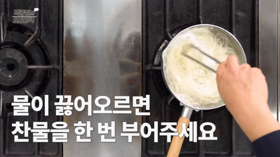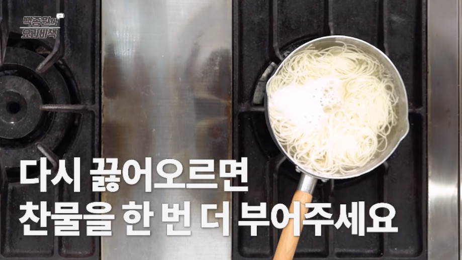 소면을 끓이다 보면 면이 완전히 익기 전에 물이 넘치려고 하는데요, 이때 찬물 반 컵을 부어주시면 됩니다. 찬물을 준비해 두었다가 끓어오를 때마다 반 컵씩 붓는 과정을 총 3번 반복하시면 면이 잘 익습니다.