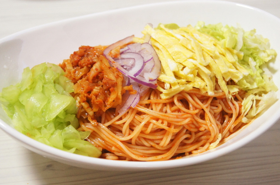 취향에 따라 양파나 대파를 썰어 넣거나 계란 지단 등의 고명을 올리면 더욱 맛있는 비빔국수가 완성됩니다.