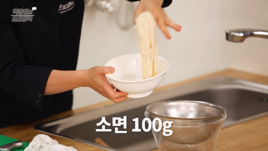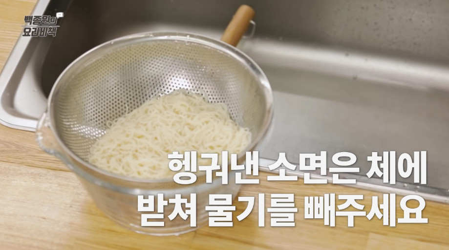 깨끗이 헹군 소면은 체에 받쳐 물기를 충분히 빼주세요.