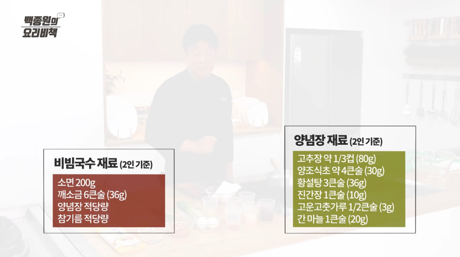 비빔국수 재료 : 소면 200g, 양념장 적당량, 참기름 적당량, 깨소금 6큰술(36g)