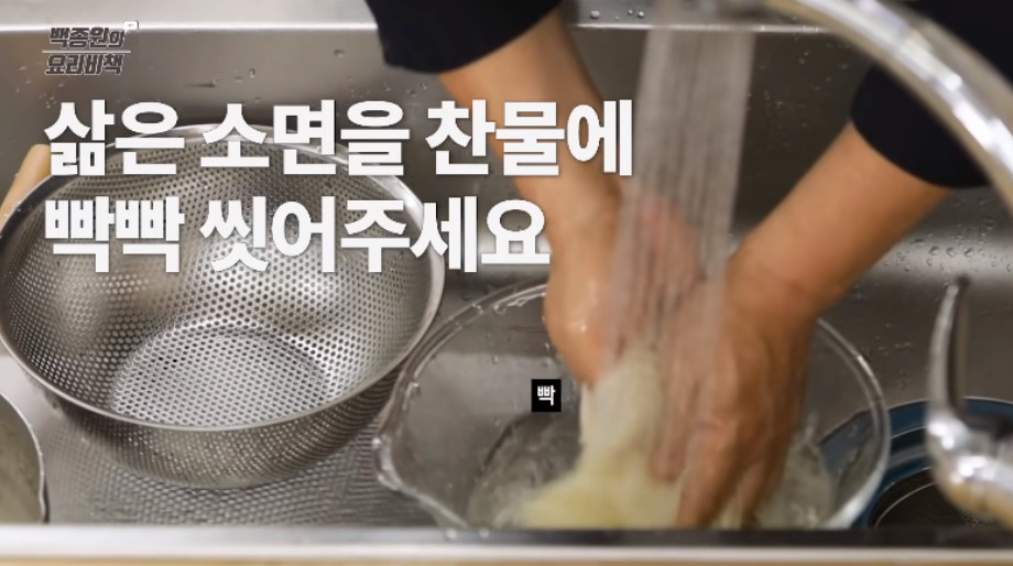 소면이 완전히 익으면 건져내 바로 찬물에 넣고 빨래하듯이 힘 있게 씻어주세요. 이렇게 씻는 이유는 소면에 남아 있는 전분을 제거해 면을 더욱 쫄깃하게 만들기 위함입니다.