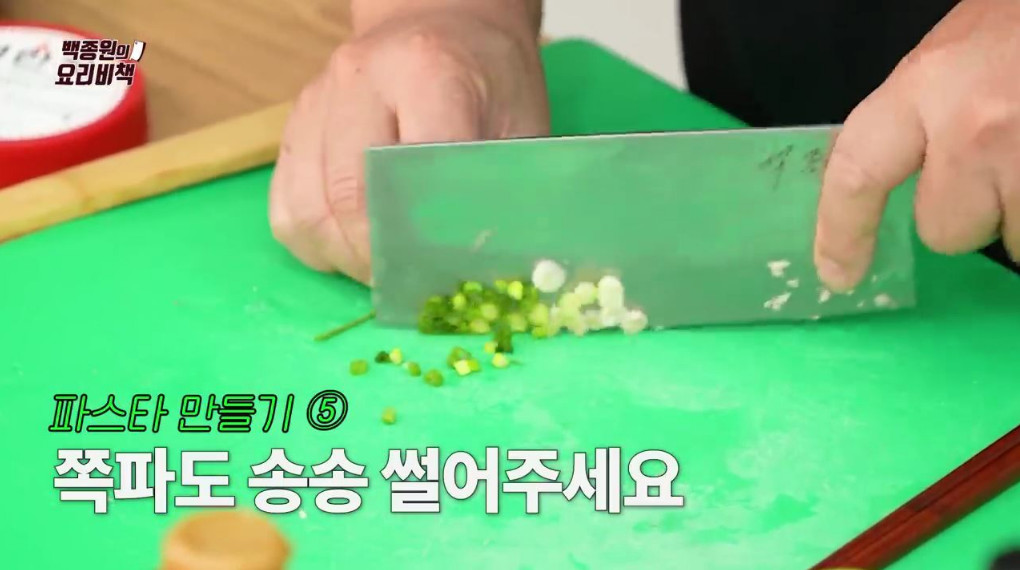 마지막으로 쪽파를 두께 약 0.3cm로 송송 썰어 올리고, 통후추와 파마산 치즈가루를 약간 뿌려줍니다. 고명용 명란젓을 조금 올려주시면 더욱 맛있으며, 쪽파 대신 파슬리 가루를 사용하셔도 괜찮습니다.