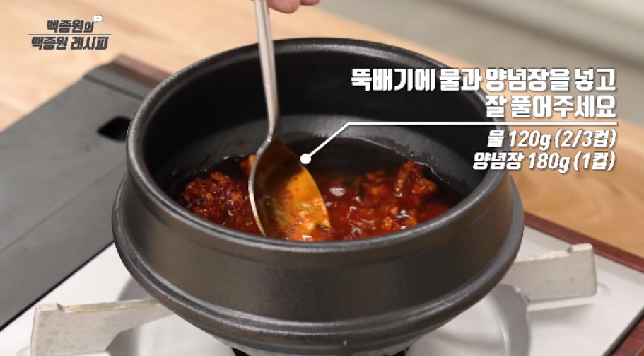 이제 순두부찌개를 끓이겠습니다. 뚝배기에 물 2/3컵과 양념장 1컵을 넣고 잘 풀어주세요. 물 대신 곰탕 국물이나 멸치 육수를 사용하셔도 됩니다.