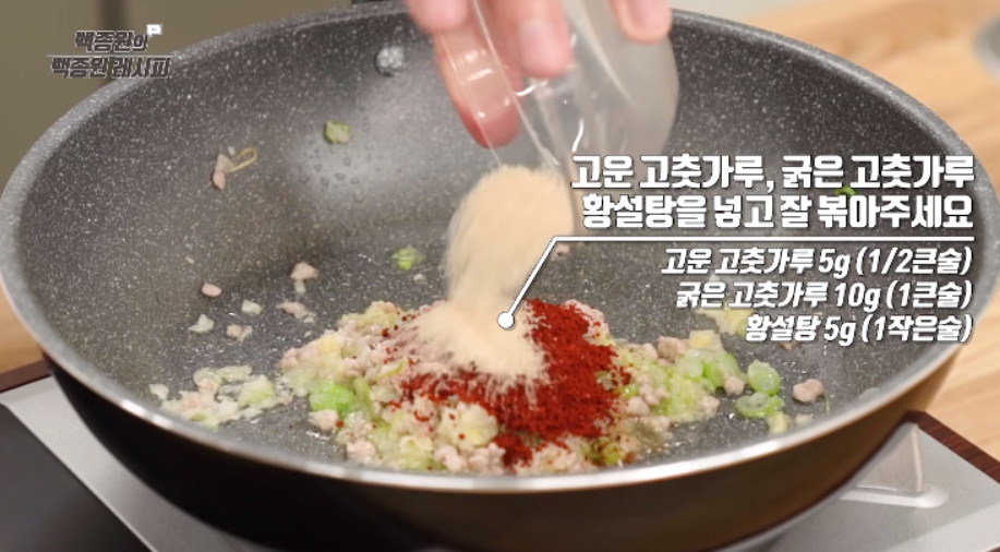 이어서 고운 고춧가루 1/2큰술, 굵은 고춧가루 1큰술, 황설탕 1작은술을 넣고 볶아주세요. 고운 고춧가루가 들어가야 밖에서 사 먹는 순두부찌개 같은 맛이 난다고 합니다. 고운 고춧가루가 없으면 굵은 고춧가루만 사용하셔도 됩니다. 이때 고춧가루가 탈 수 있으니 잠시 불을 끄고 물을 소량 넣어 볶아주시면 좋습니다.