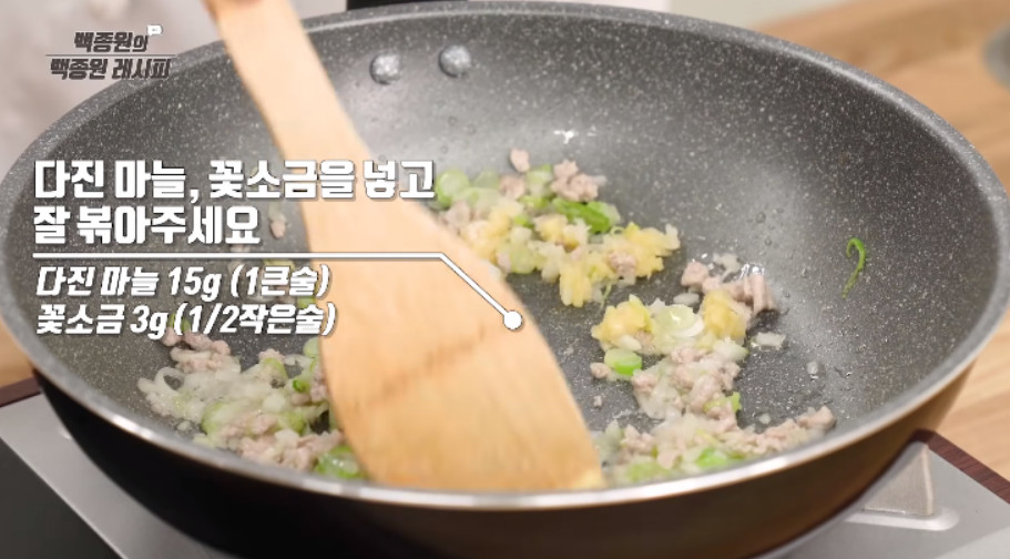 여기에 다진 마늘 1큰술과 꽃소금 1/2작은술을 넣고 함께 볶아줍니다.