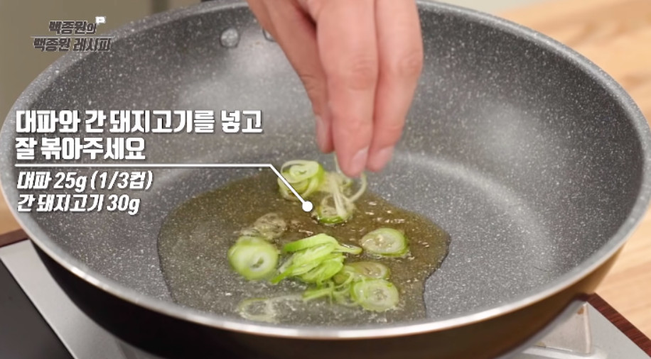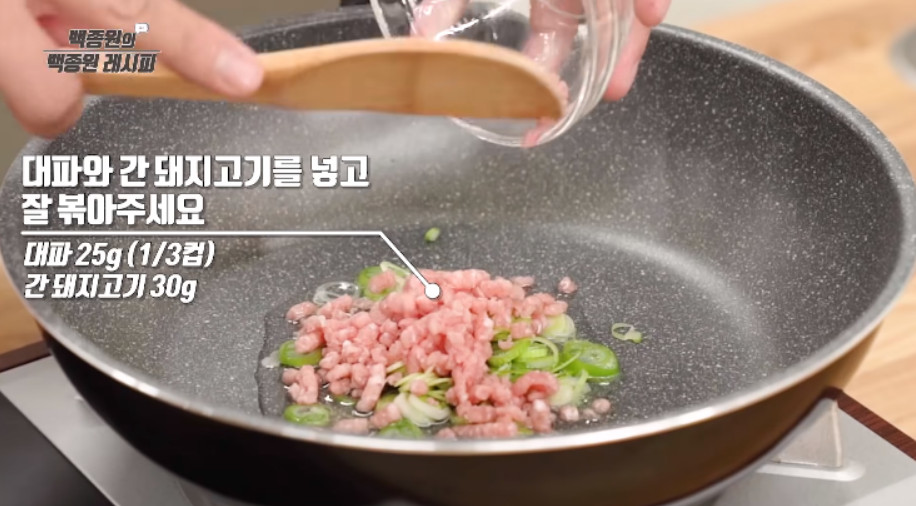 기름을 두른 팬에 대파 1/3컵과 간 돼지고기 30g을 넣고 뭉치지 않도록 풀어가며 볶아주세요. 대파 대신 쪽파를 사용하셔도 되고, 돼지고기 대신 소고기나 닭고기를 넣어도 무방합니다.
