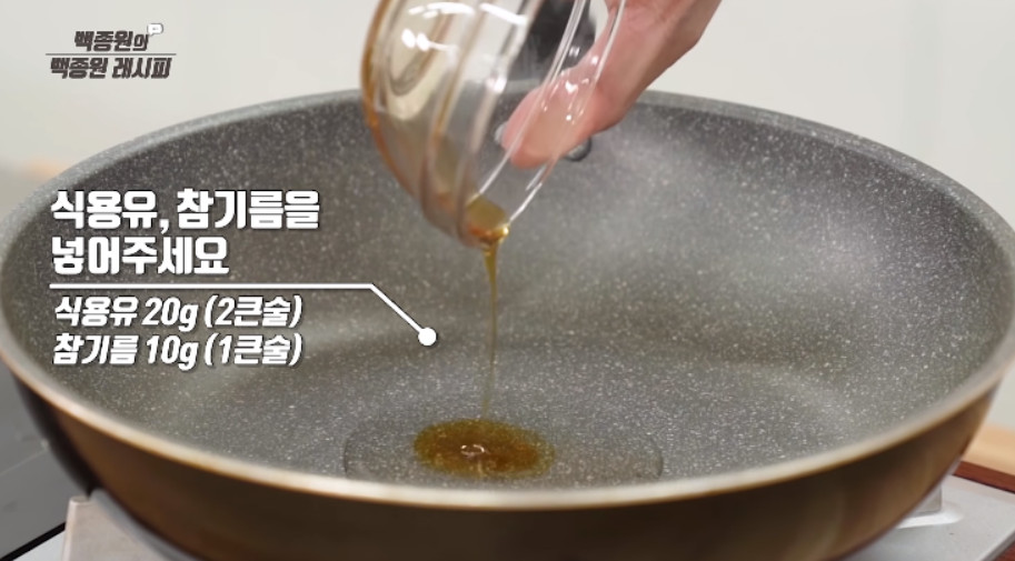 먼저 순두부찌개에 들어갈 양념장을 만들어 주세요. 프라이팬에 식용유 2큰술과 참기름 1큰술을 두릅니다. 순두부찌개에는 참기름이 들어가야 맛이 좋다고 하며, 식용유 대신 올리브유는 피하고 카놀라유는 사용하셔도 괜찮다고 합니다.