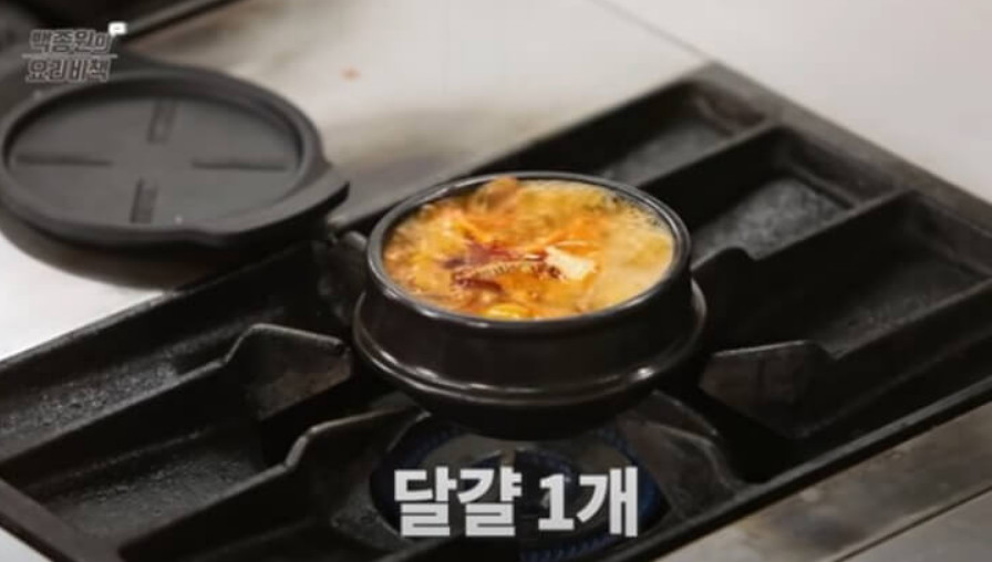 찌개가 보글보글 끓어오르면 먹기 직전에 계란 1개를 깨뜨려 넣어주세요.
