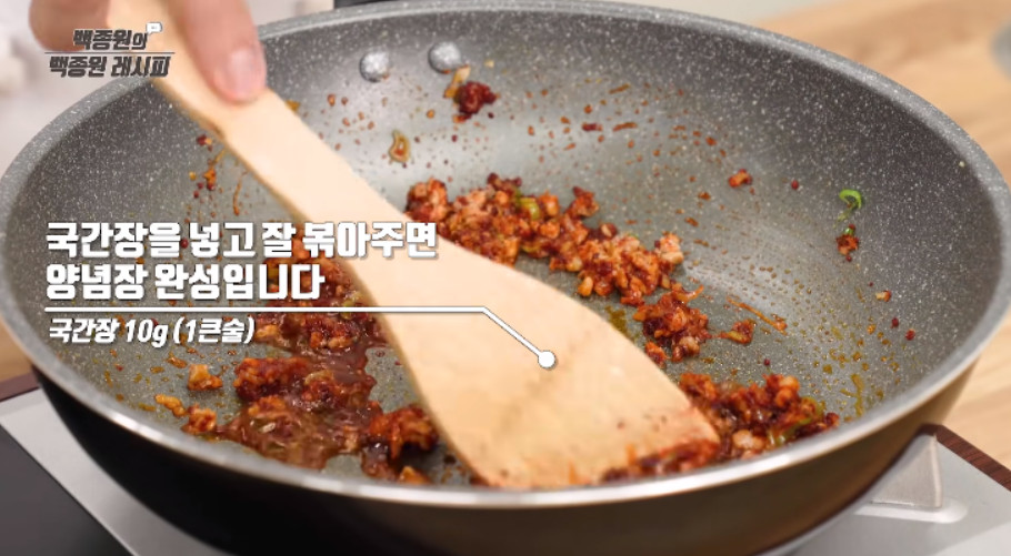 마지막으로 국간장 1큰술을 넣고 잘 볶아주면 양념장이 완성됩니다.