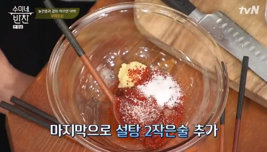 이렇게 오이를 크게 써는 이유는 써는 방식에 따라 식감이 크게 달라지기 때문인데요, 큼직하고 두툼하게 썰어주는 것이 김수미식 오이무침의 첫 번째 포인트입니다.