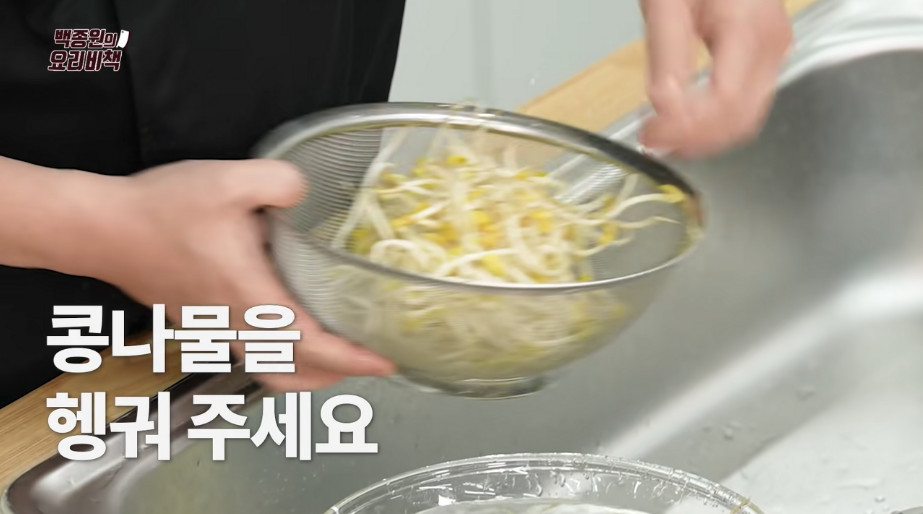 1. 먼저 콩나물을 손질해 주세요. 흐르는 물에 콩나물을 깨끗이 헹군 뒤 체에 밭쳐 물기를 제거해 주시면 됩니다. 이때 콩나물 뿌리는 떼지 않으셔도 되는데, 뿌리 부분에 콩나물의 주요 영양소인 아스파라긴산이 가장 많이 들어 있기 때문입니다.