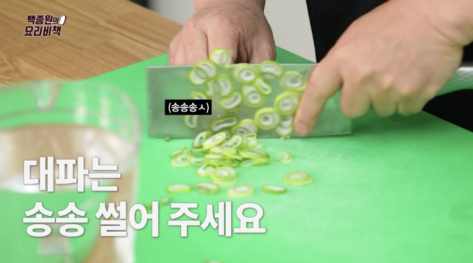 2. 대파 1/2대와 청양고추 1개를 약 0.3cm 두께로 송송 썰어 주세요. 가능하면 최대한 얇게 썰어주시는 것이 좋습니다.