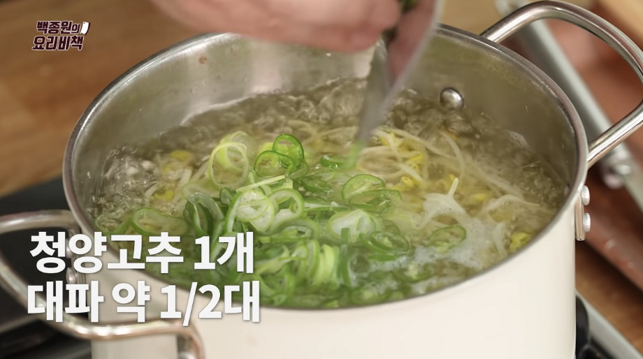 5. 국이 다시 끓어오르면 중불로 줄인 뒤 약 5분 정도 더 끓여 주세요. 마지막으로 썰어둔 청양고추 1개와 대파 1/2대를 넣고 1분 정도 더 끓이면 콩나물국이 완성됩니다.