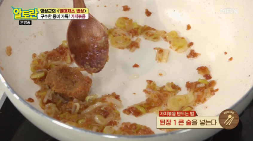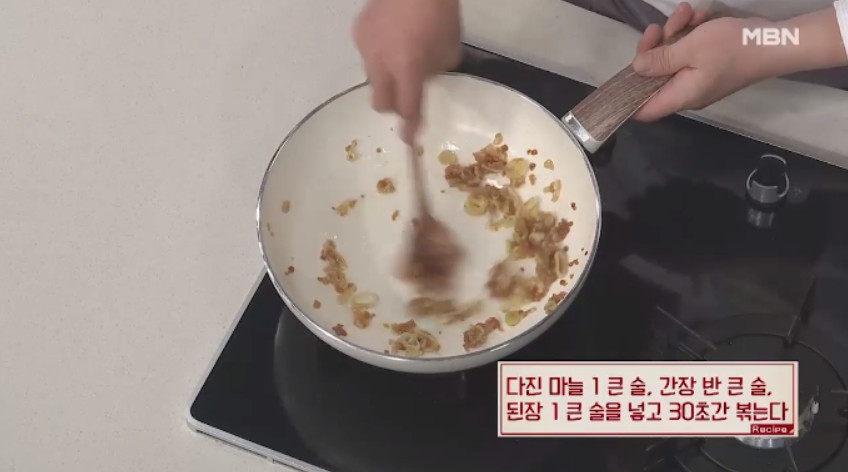 8. 두 번째 팁은 된장을 넣어주는 것입니다. 프라이팬에 된장 1큰술을 넣고 대파, 마늘과 함께 볶아주면 구수한 풍미가 살아나고 된장의 떫은맛도 줄어듭니다.