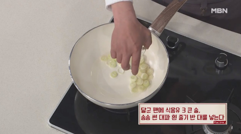 6. 달군 프라이팬에 식용유 3큰술을 두르고, 송송 썬 대파 흰 부분 반 대와 다진 마늘 1큰술을 넣어 볶아주세요.