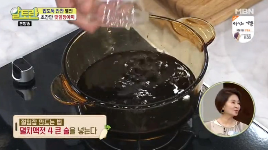 6. 이제 양념을 더할 차례입니다. 절인 깻잎은 가볍게 눌러 절임장을 짜내고, 나온 절임장은 버리지 말고 따로 보관해 주세요. 이미 멸치육수, 간장, 액젓, 식초가 들어 있어 추가 재료만 더하면 되므로 별도의 양념장을 만들 필요는 없습니다.