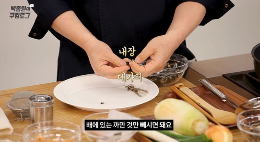 1. 먼저 잔치국수의 핵심인 육수부터 준비합니다. 준비한 멸치는 내장을 모두 제거해 주세요.