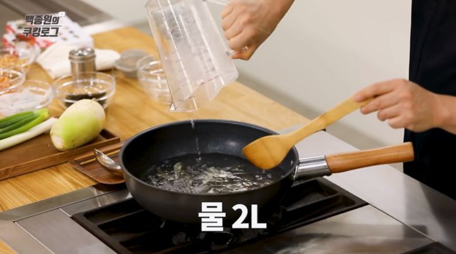 4. 멸치와 디포리를 어느 정도 볶아 비린 향이 줄어들면 물 3L, 대파, 양파, 다시마, 맛술을 넣고 끓여 주세요.