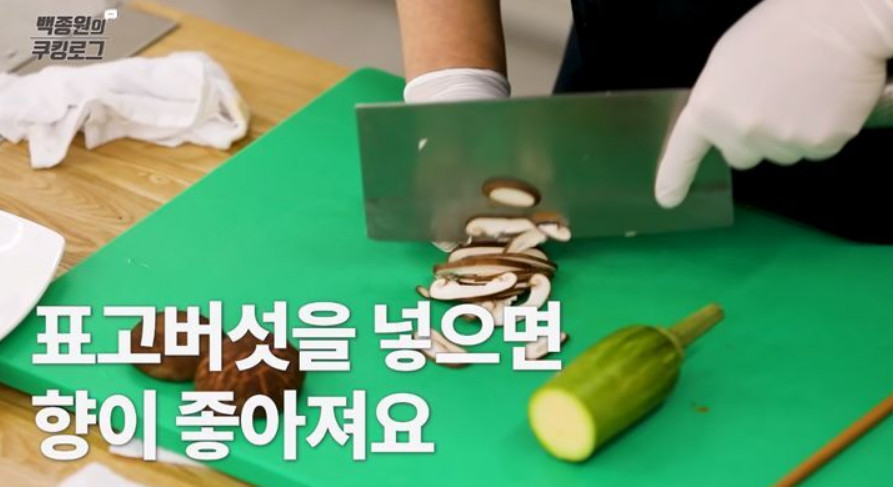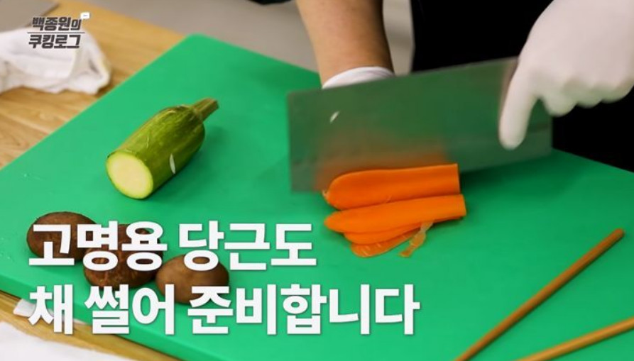 9. 이제 고명을 준비합니다. 양파, 당근, 애호박, 표고버섯을 채 썰어 주세요.