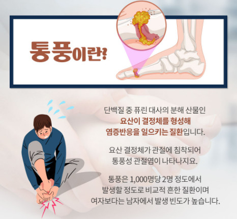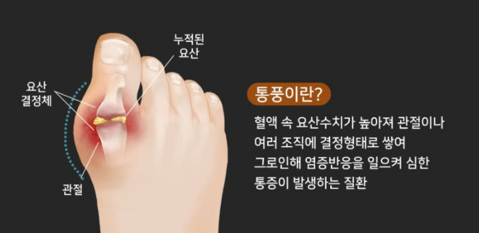 통풍은 갑자기 관절이 빨갛게 부어올라 심한 통증을 유발하는 질환으로 주로 요산에 의해 발생하게 됩니다. 요산은 우리 몸의 세포가 죽을 때 나오는 퓨린이라는 물질에 의해 만들어지고 신장을 통해 소변으로 배출됩니다. 통풍은 이 혈액 속에 요산이 너무 많이 축적되어 염증을 일으킨 결과입니다. 오늘은 이러한 통풍 증상 및 치료법에 대해서 자세히 살펴보겠습니다.