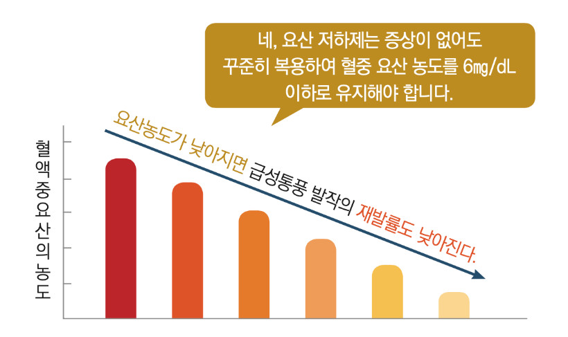 갑자기 시작되는 엄지발가락의 심한 통증과 붓기, 발적과 열이 나는 것이 주요 증상인 급성 통풍성 관절염은 소염 진통제를 사용해 통증을 억제합니다. 또한 치료를 하지 않아도 일주일 정도 지나면 저절로 낫기도 합니다. 만성 통풍(1년에 2회 이상 통풍 발작이 있거나 관절에 요산결절이 만져지는 경우, 요산으로 인한 신장결절이 있는 경우)의 경우 적극적인 치료와 예방을 위해 요산억제제나 요산방출제를 복용합니다.