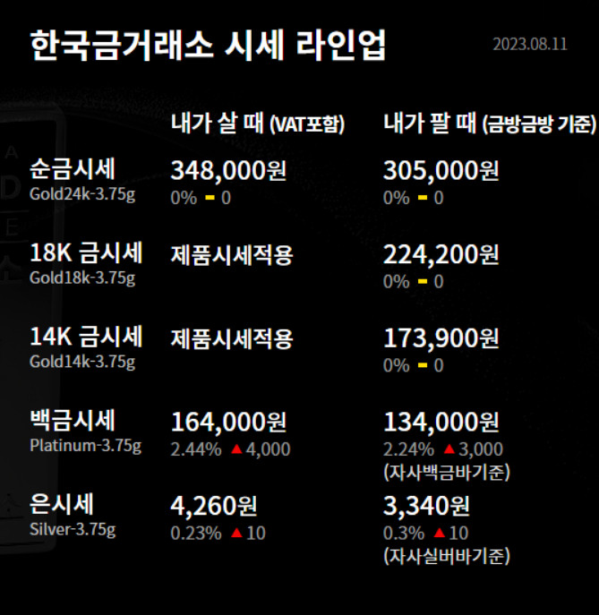 또한 18K 금시세(금값)는 팔때 227,500원, 살때 255,500원에 거래되고 있고, 14K 금시세(금값)는 팔때 176,500원, 살때 199,500원에 거래되고 있습니다. 백금(Platinum-3.75g)은 팔 때 135,000원, 살 때 147,000원에 거래할 수 있으며 은(Silver-3.75g)은 팔 때 3,400원, 살 때 3,700원에 거래할 수 있습니다.
