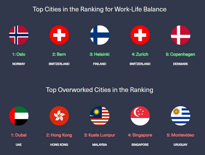 먼저 전 세계에서 워라벨이 가장 좋은 도시는 노르웨이의 오슬로가 차지하였습니다. 뒤이어 스위스 베른, 핀란드 헬싱키, 스위스 취리히, 덴마크 코펜하겐 순으로 톱 5위에 이름을 올렸습니다.